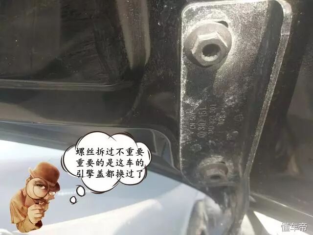 這輛車的引擎蓋漆面明顯新于合頁、即可說明引擎蓋是換過的